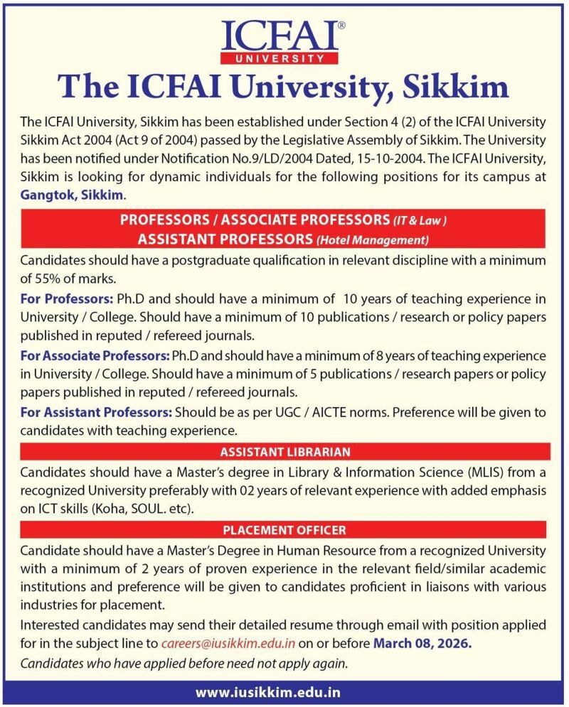 | Apply by mail | Interested Candidates may send in their applications with resume by clearly mentoring the post applied for and campus preference in the subject line, to: Careers@iusikkim.edu.in |